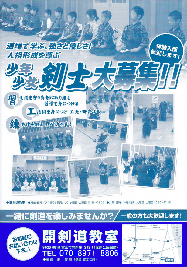 富山市の剣道教室。小学生からの少年・少女剣士と、もう一度剣道がしたいあなたをお待ちしています。